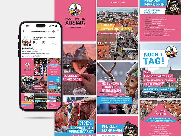 Im Mittelpunkt stand die Entwicklung eines neuen Corporate Designs, das die Lebendigkeit der Altstadt widerspiegelt: frisch, mutig und aufmerksamkeitsstark. Ergänzend dazu wurde ein Social Media Konzept mit klarem Fokus auf Instagram entwickelt – mit knalligen Postings, starken Farben und authentischen Einblicken. Geschichten aus der Altstadt, besondere Orte und kleine Highlights wurden visuell inszeniert, um Neugier zu wecken und echte Besuchsmomente schon im Feed erlebbar zu machen.